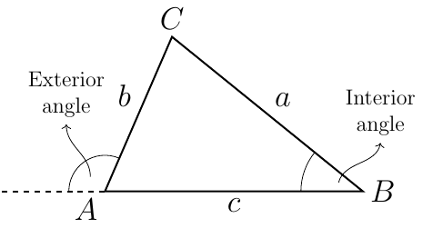 \begin{align} \angle a &= \angle ABC + \angle BCA \\ \angle b &= \angle BAC + \angle BCA \\ \angle c &= \angle BAC + \angle ABC \end{align}The sum of the exterior angles of a triangle is \(360^\circ\).
